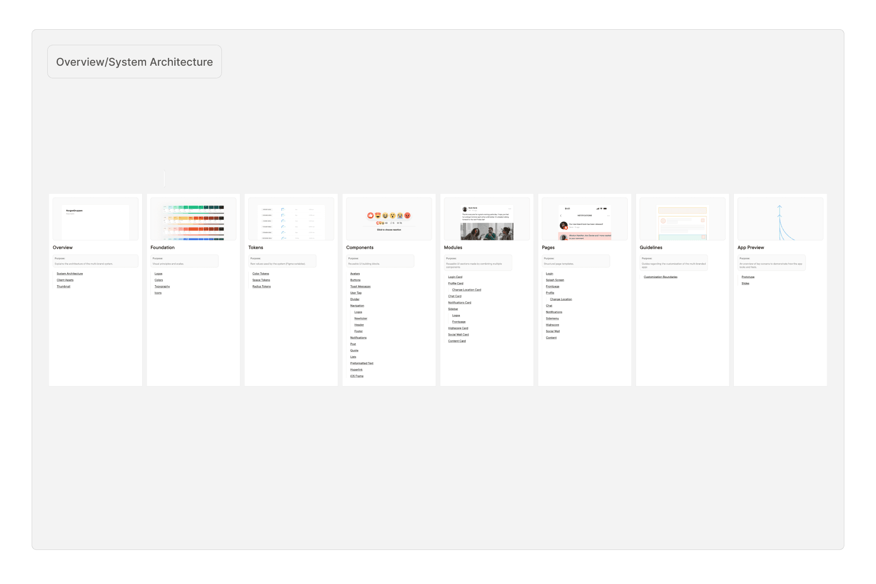 We started with the tokens, some fixed across all brands, some customizable per brand through Figma variables and modes. The idea was that switching a brand mode would update the entire system automatically, without any manual work or duplication. From there, components, modules, and pages all followed the same logic, every part designed and adapted to the token system.